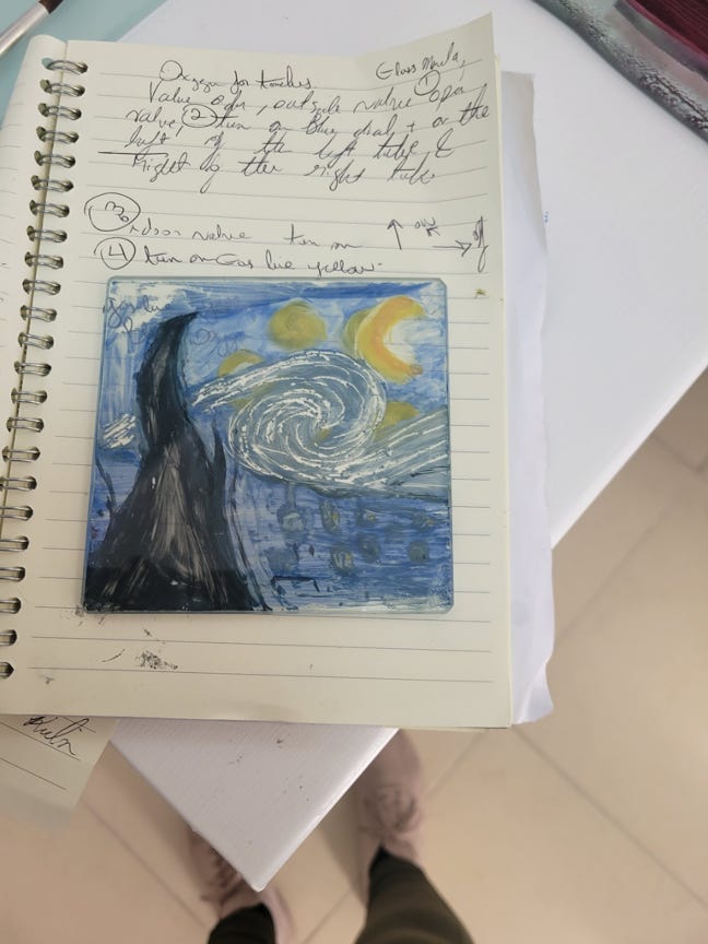 This enamel test tile — loosely inspired by Van Gogh’s Starry Night — became my first real encounter with how color, opacity, and firing schedule interact in glass painting.