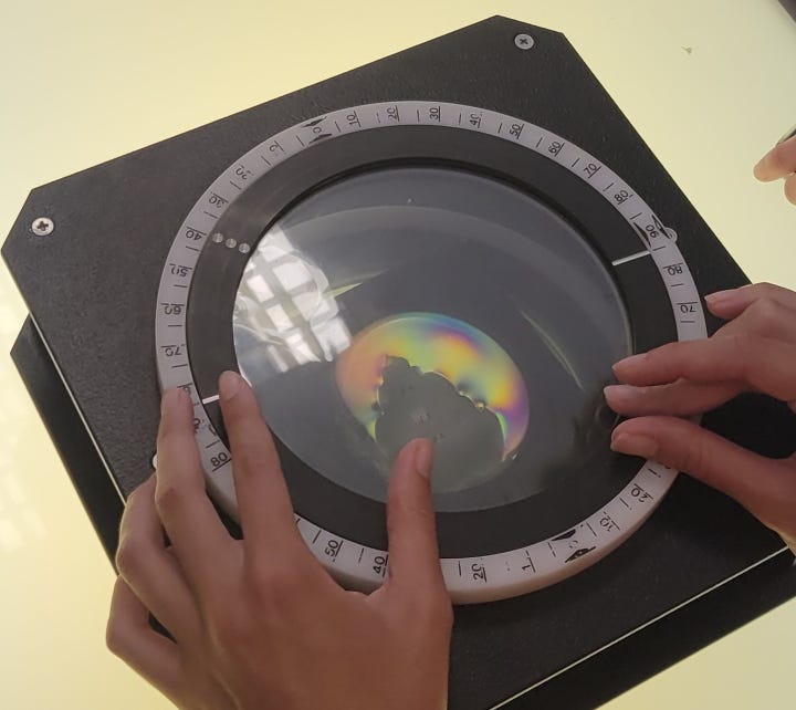 Back in the lab, we viewed stress birefringence under a polariscope. Rainbow isochromatic fringes mapped internal strain — contours of the glass’s thermal history. Few, faint fringes imply a good anneal; dense, warped colors at joins signal stress.