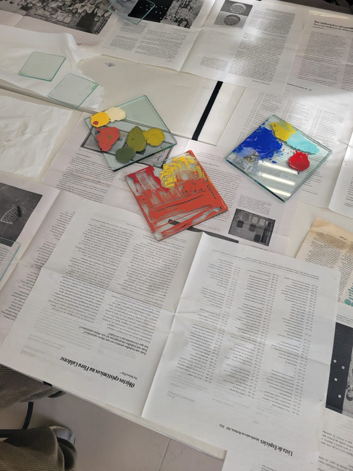 Mixing enamel paints on glass tiles to build palettes for our compatibility experiments.