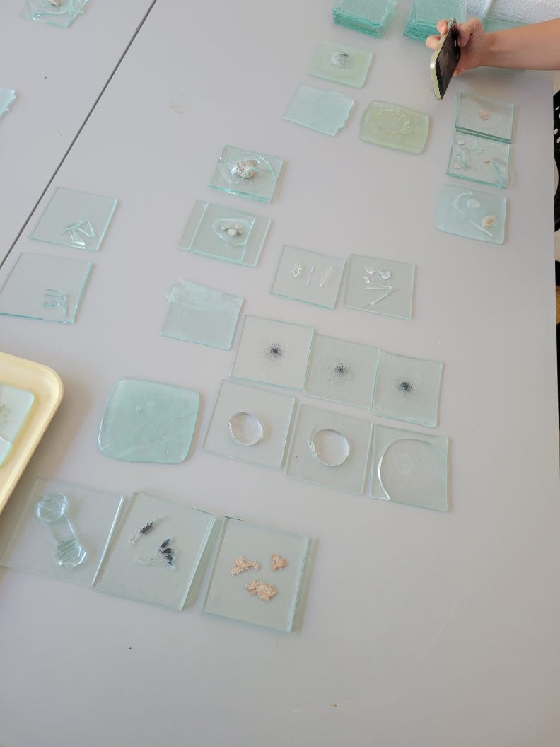 We learned to cut tiles, fire up the grinder and ground down the edges, layered color, and ran a three‑temperature firing series. Some cracked, some fused, some slumped.